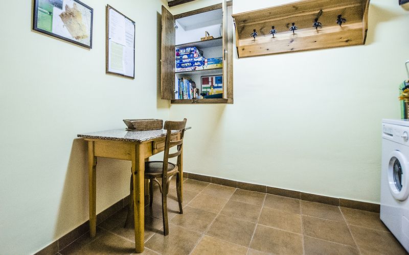 El pequeño hall que recepciona la casa da paso a un espacioso salón-comedor, con chimenea y televisión, que invita al descanso, ideal para pasar un rato agradable en compañia de amigos, familia y pareja. En la misma estancia encontraremos una cocina completamente equipada con todo tipo de electrodomésticos y utensilios básicos (frigorífico, vitrocerámica, microondas, horno-opcional, batidora, tostadora, cafetera, exprimidor y demás menaje ). A su vez tendremos acceso a un aseo con plato de ducha y un cuarto auxiliar con lavadora, plancha, botiquín, tendedero y juegos de mesa, puzzles y juguetes.